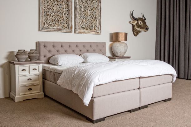 De volgende opties zijn mogelijk tegen een meerprijs; Breedte 200 cm, lengte 210 cm of 220 cm, luxere stof, luxere poten, topdek in cellutex, natuurlatex of compose, een bijpassend voetbord, ander model hoofdbord en hockers.
